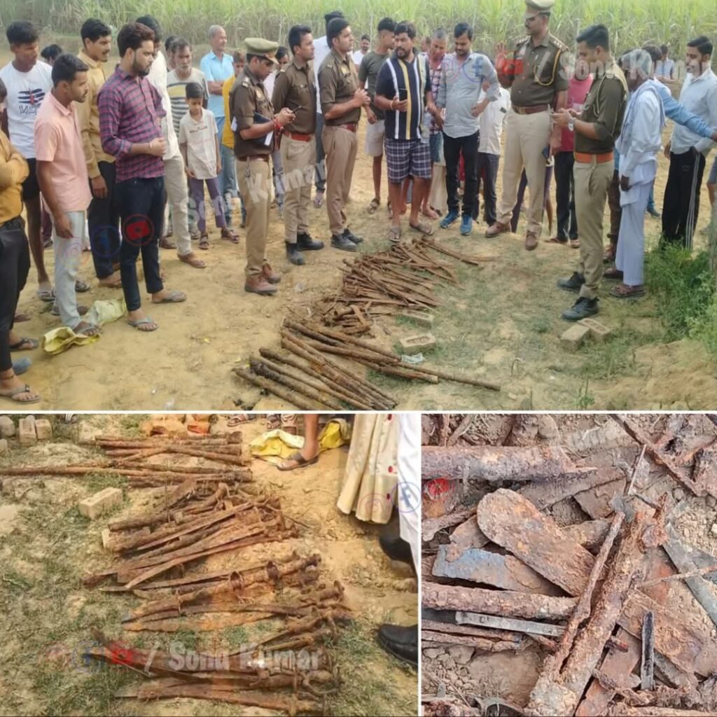 शाहजहांपुर जिले के इस खेत से तलवारें, भाले, खंजर और बंदूक के लोहे के हिस्से मिले हैं, जिन्हें प्रारंभिक तौर पर 18वीं सदी का बताया जा रहा है। हथियारों पर जंग लगी हुई है, जिससे अंदाज़ा लगाया जा रहा है कि ये करीब 200 साल से जमीन में दफन थे।