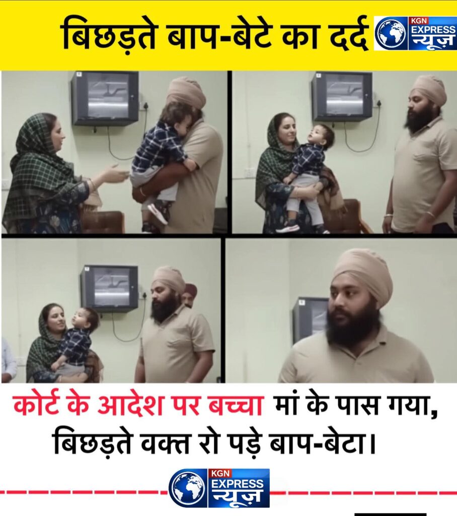 ग्वालियर से दिल तोड़ देने वाली घटना का वीडियो सामने आया है जिसमें एक महिला सोमप्रीत कौर अपने पति और बेटे को छोड़कर फरार हो गई थी और तीन दिन बाद पुलिस ने उसे पंजाब के एक गुरुद्वारे से खोज निकाला लेकिन बाद में सोमप्रीत कौर ने अपने ससुराल पक्ष पर दहेज प्रताड़ना का आरोप लगाया और मायके में रहने की इच्छा जताई कई दिनों तक केस चला और आखिरकार कोर्ट ने दोनों परिवारों की सहमति से पति-पत्नी के तलाक को मंजूरी दे दी और बेटे को मां सोमप्रीत कौर के पास रहने का फैसला सुनाया लेकिन जब आखिरी दिन पति अपने बेटे को सौंपने पहुंचे तो वो पल हर किसी का कलेजा चीर देने वाला था बेटा अपने बाप के गले से चिपककर फूट-फूट कर रोने लगा और मां के पास जाने को तैयार नहीं हुआ लेकिन मां जबरदस्ती बेटे को लेकर चलने लगी और पीछे खड़ा पिता अपने बेटे को जाते हुए घुटन भरी निगाहों से देखता रहा उसकी आंखों से आंसू रुक नहीं पाए वहां मौजूद किसी शख्स ने इस पूरे मंजर का वीडियो बना लिया जो अब सोशल मीडिया पर वायरल हो रहा है वीडियो देखकर हर किसी की आंख नम हो गई दोस्तों सोचिए उस वक्त उस बाप ने खुद को कितना पत्थर दिल बनाया होगा अपने ही कलेजे के टुकड़े को जाते हुए देखने के लिए सोचकर ही रूह कांप जाती है