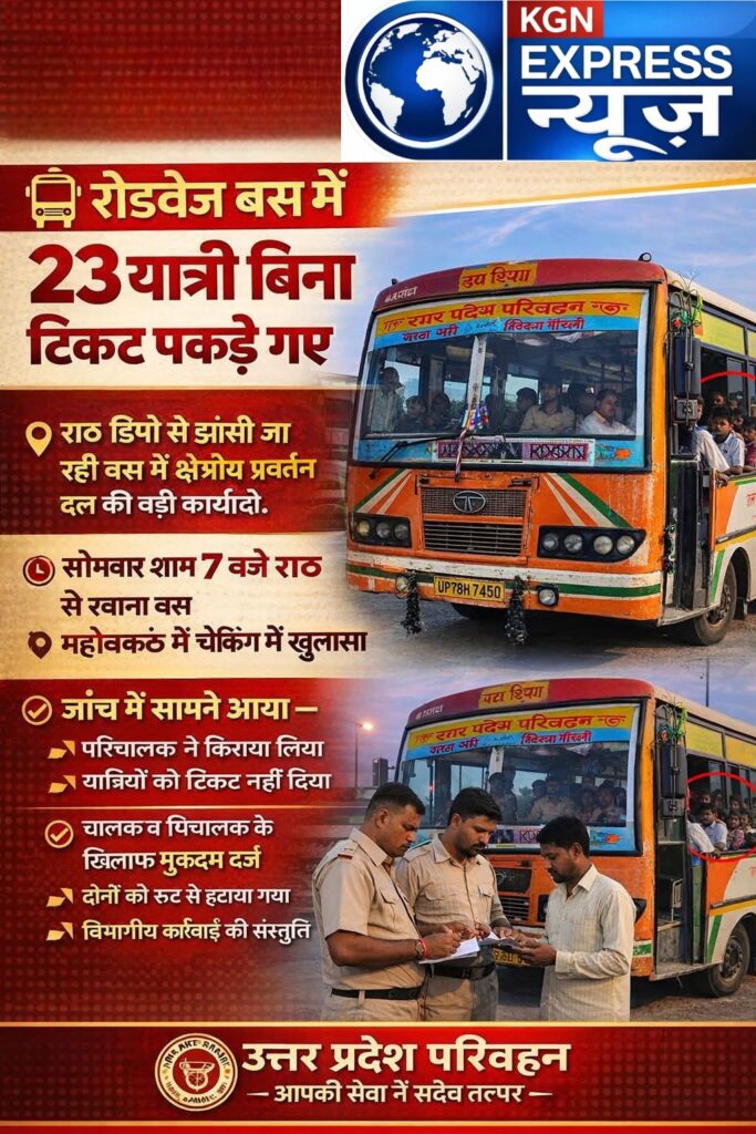 हमीरपुर – रोडवेज बस में 23 यात्री बिना टिकट पकड़े गए। क्षेत्रीय प्रवर्तन दल ने राठ डिपो से झांसी जा रही बस में 23 यात्रियों को बिना टिकट पकड़ा है। बस सोमवार शाम 7 बजे राठ से रवाना हुई थी। महोबकंठ में चेकिंग के दौरान प्रवर्तन दल के अभिषेक मिश्रा और अमित अवस्थी ने बस रोकी। जांच में सामने आया कि परिचालक ने किराया तो लिया लेकिन टिकट नहीं दिया। इस मामले में हरपालपुर थाने में चालक और परिचालक के खिलाफ मुकदमा दर्ज कराया गया है। एआरएम ने दोनों को रूट से हटा दिया और विभागीय कार्रवाई की संस्तुति भेजी है। ll #upsrtc #roadways